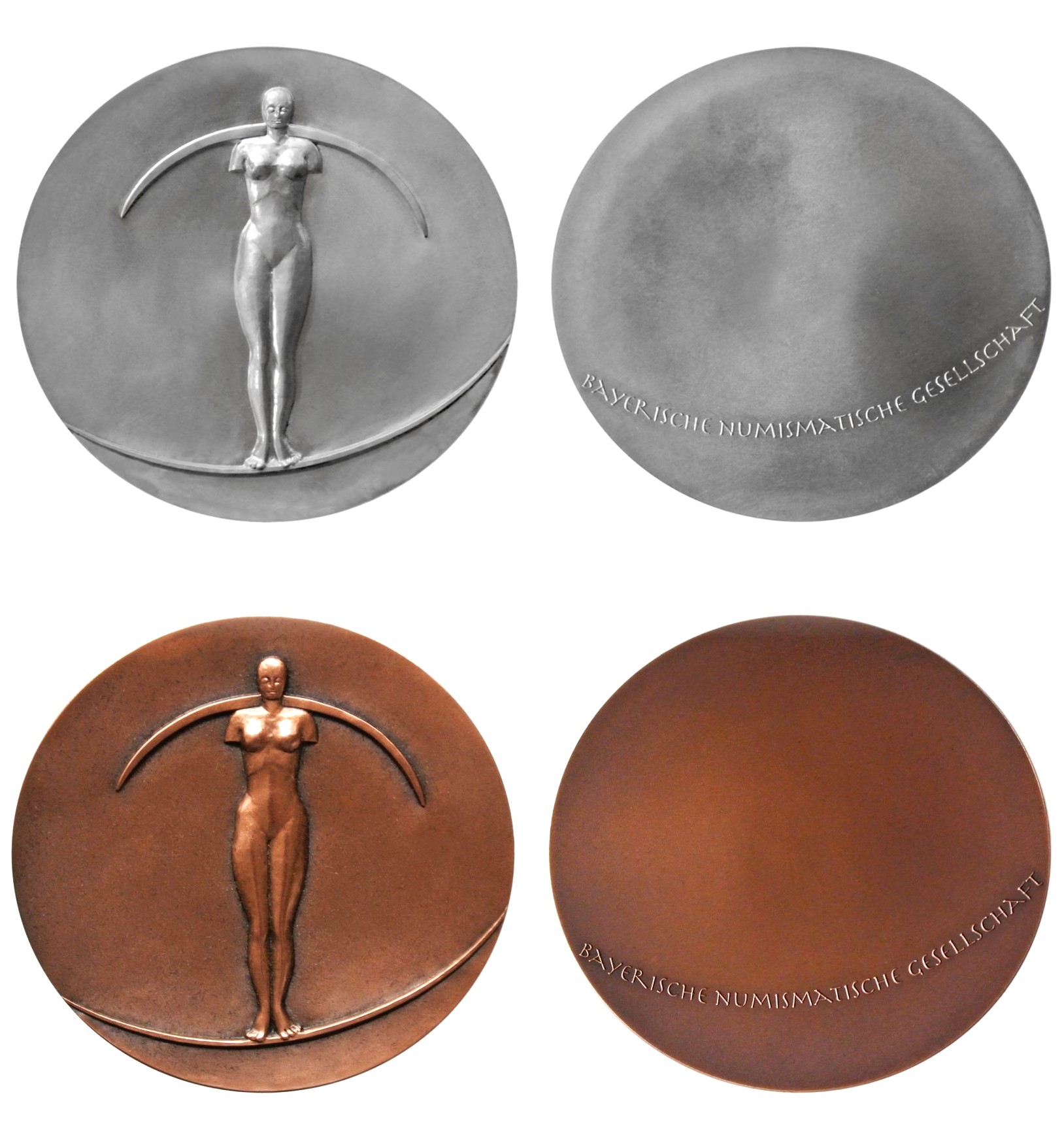 Der weibliche Torso trägt auf seinen Schultern eine an beiden Enden nach unten gekrümmte Stange, die den Betrachter an eine Wasserträgerin erinnert: Unweigerlich denkt man daran, wie schwierig es ist, bei einer schweren Last die ‹Balance› zu halten. Auf der Medaille der BNG hat die Künstlerin dieser schönen weiblichen Gestalt noch eine gegenläufige gekrümmte Linie unter ihre Füße gesetzt. Dies verleiht ihr, indem sie sich einer auf der Mondsichel stehenden Madonna annähert, einen Hauch von Transzendenz. Der Vorstand der BNG fand in dieser Medaille Aspekte der gegenwärtigen und auch zukünftigen Aufgaben der Gesellschaft reflektiert, insbesondere jene Schwierigkeit, in einer sich immer schneller wandelnden Welt mit ständig neuen Herausforderungen die Balance zu halten zwischen dem Bewahren guter alter Traditionen und den Zwängen, mit der Zeit zu gehen und neue Entwicklungen in das eigene Handeln zu integrieren. Beides in Harmonie zu bringen und zu halten, ist eine zentrale Aufgabe einer bedeutenden kulturellen Institution, wie es die BNG ist. Insbesondere ist sie für die Herausgabe der einzigen deutschen wissenschaftlichen numismatischen Zeitschrift mit internationaler Geltung verantwortlich, unterstützt gemäß ihrer Satzung die Veröffentlichung wissenschaftlicher wertvoller Publikationen und trägt zum harmonischen Miteinander von Sammlern, Wissenschaftlern und Münzhändlern bei. Gemäß Vorstandsbeschluss wird die Medaille in begrenzter Auflage in Bronze (120 nummerierte Exemplare zum Preis von 99 Euro, für Mitglieder 89 Euro) und in Silber (50 Exemplare) geprägt. Die Bronzeversion wird zum Verkauf stehen, die silberne Ausführung kann nur auf Vorstandsbeschluss für Verdienste um den Verein verliehen werden.